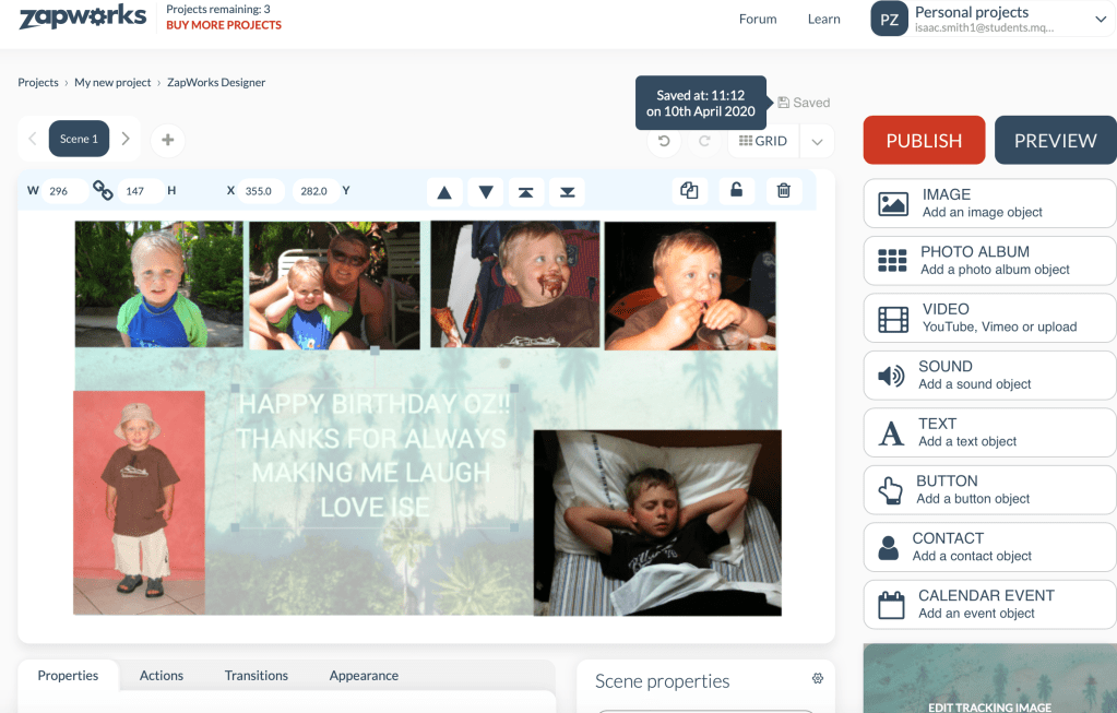 To test out the simple drag-and-drop element of ZapWorks I made an Augmented birthday card for my younger brother. I found the ‘designer’ page a little confusing but once the zapcode was recognised, the images that appeared on the screen were an interesting way of viewing a card. In a classroom environment, AR allows students to instantly view their creations on screen. ZapWorks enables students to get creative, be engaged and feel empowered by developing their own experience.