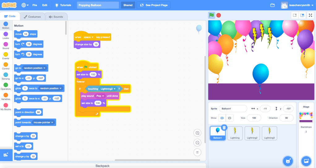 Scratch is a great tool for game creation and helps tailor learning opportunities for individual student needs. While scratch is great for student learning, without explicit instruction, teachers may find the program difficult to follow and use productively. I have created a simple program for popping a balloon. However, without explicit instruction from the tutorial I would have gotten lost in the small details of scratch and where the icons and codes I needed were positioned.